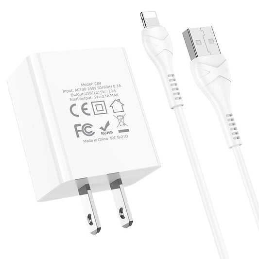HOCO 2.1A DUAL WALL CHARGER INCLUDING LIGHTNING 3FT USB CABLE C89-LIGHTNING