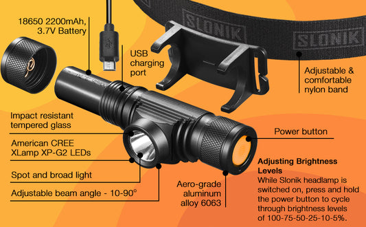 SLONIK LED Headlamp Flashlight - 500 Lumen USB Rechargeable Headlight S10