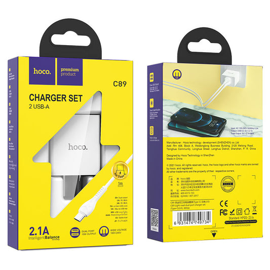 HOCO DUAL WALL CHARGER 2.1A INCLUDING TYPE-C TOA CABLE C89
