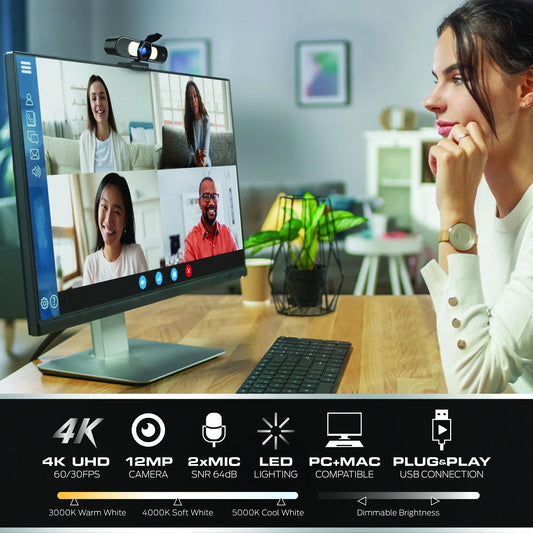 Webcam de téléconférence Monster Insight Focus Premium 4K UHD avec mise au point automatique et lumière contrôlable, 3084 x 2160p 4K Ultra HD 12 mégapixels, USB Plug and Play
