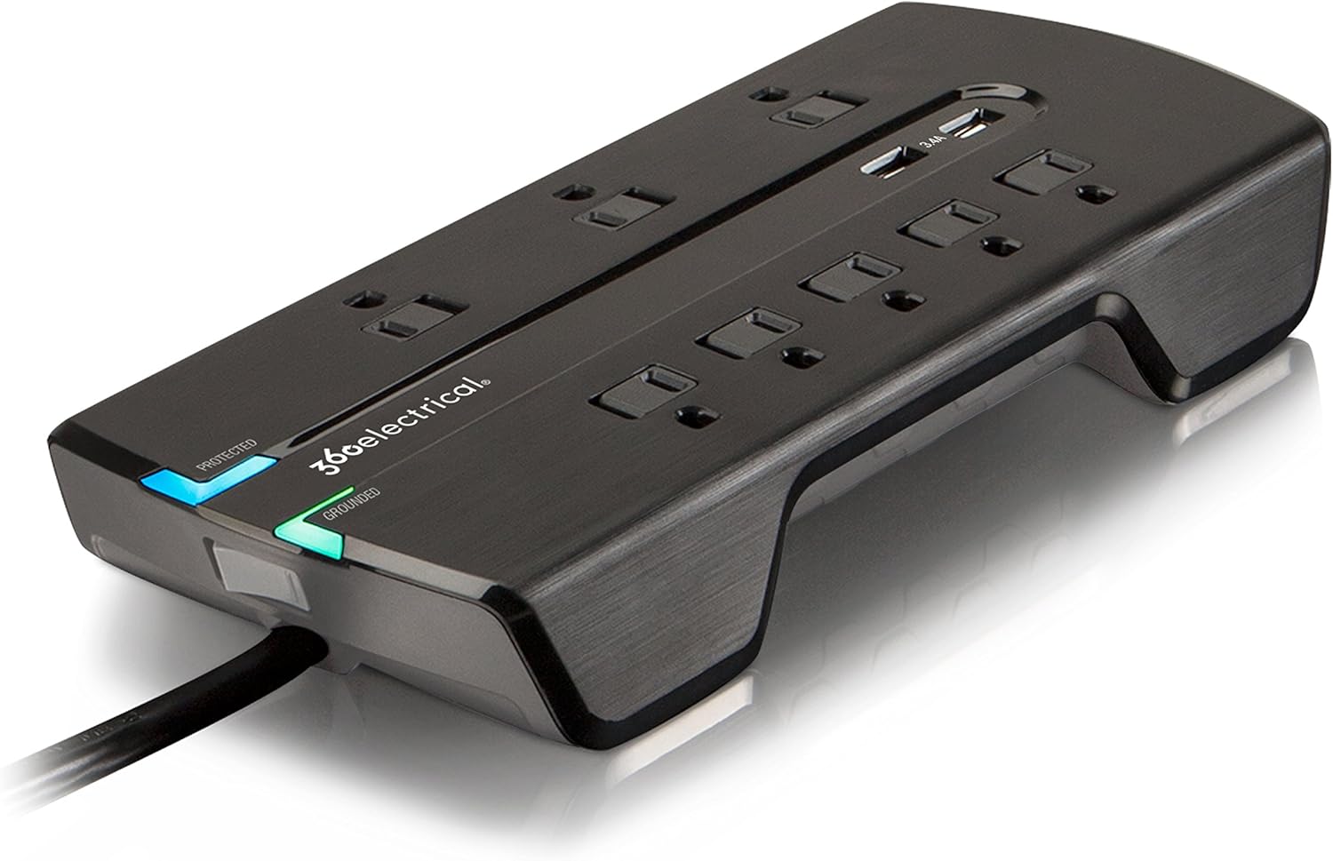 360 ELECTRICAL DIRECTOR 3.4 8-OUTLET SURGE STRIP WITH 2 X 3.4A USB PORTS, COAX & RJ11/RJ45 AND 1.8-METER (6-FT) CORD- BLACK