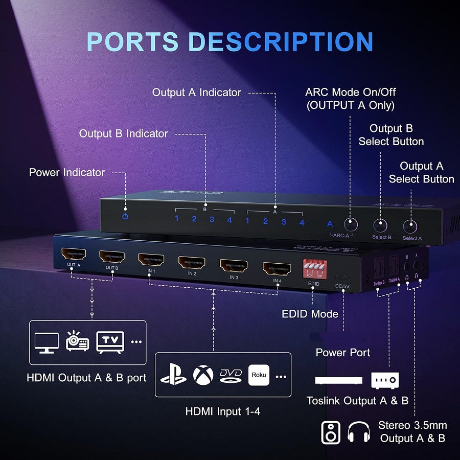 - Audio Extractor, ARC, Downscale and EDID Support audio extraction from HDMI Output A and Output B, and split it to Toslink, and 3.5 mm at the same time, only Output A support Audio Return Channel(ARC), can manually EDID setting to downscale from 4K 60Hz(4:4:4,4:2:2,4:2:0) to 1080P 60Hz.NOTE: Only Output A support ARC. This matrix doesn't support CEC.