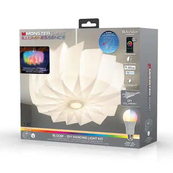Whether you're indoors or outdoors, having the right lighting can make a huge difference. And with the Monster Smart Illuminessence Bloom DIY Hanging Light Kit, you can easily transform any space. The kit comes with a A19 LED bulb that you can use to create unique lighting effects with our downloadable app. Whether you're at home or away, you can quickly and easily make changes to your lighting. In addition to the multicolor effects, the kit also includes a warm white light that's perfect for everyday use. With our Razer Chroma RGB technology, you can even sync your lights to compatible PC accessories, games, and music for even more stunning results. And if you link your kit to Alexa, Siri, or Google Assistant, you can control your lights using just your voice. Installing the kit is a breeze thanks to the 15 ft. extension cord, 2 ceiling hooks, and 2 cord hooks that are included. Illuminate your space with the Smart Illuminessence Bloom DIY Hanging Light Kit and experience the difference great lighting can make!