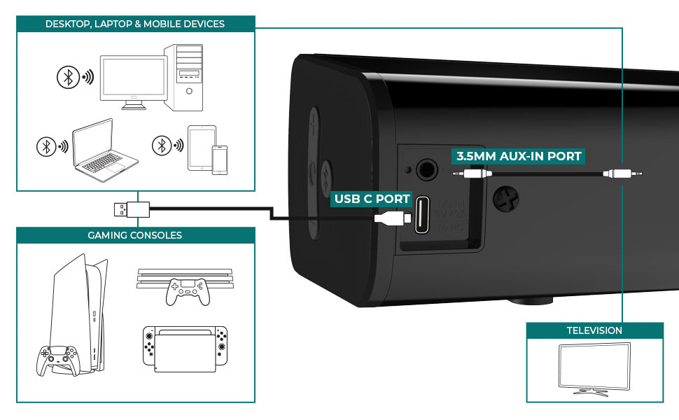 * 3.5 mm AUX-in for analog devices like MP3 player, DACs, or receivers — Allows for universal compatibility across other analog audio devices.