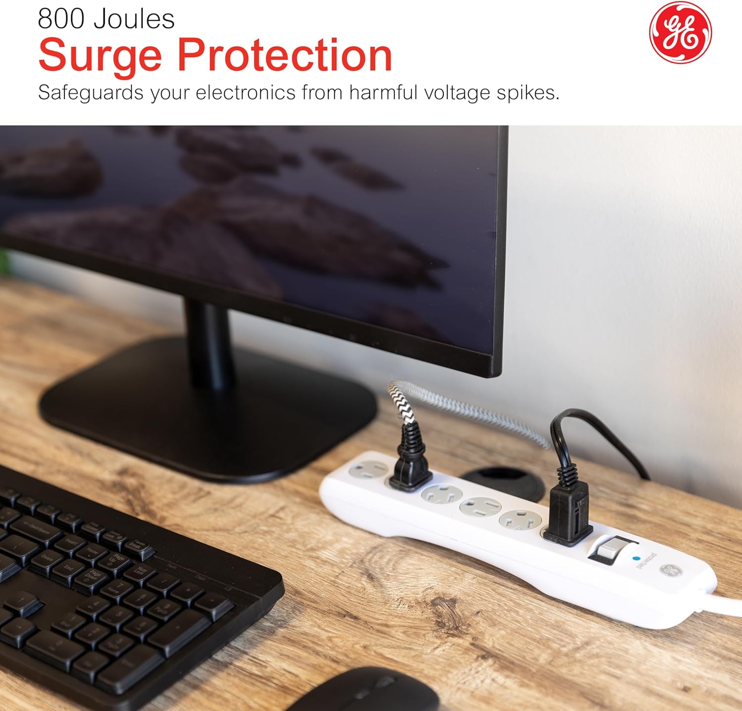 GE 6-Outlet Surge Protector, 10 Ft Extension Cord, Power Strip, 800 Joules, Flat Plug, Twist-to-Close Safety Cover 62933