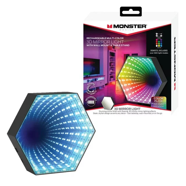Monster LED Rechargeable Multi-Color 3D Mirror Light, 300 Possible Settings, Compact, USB-Powered