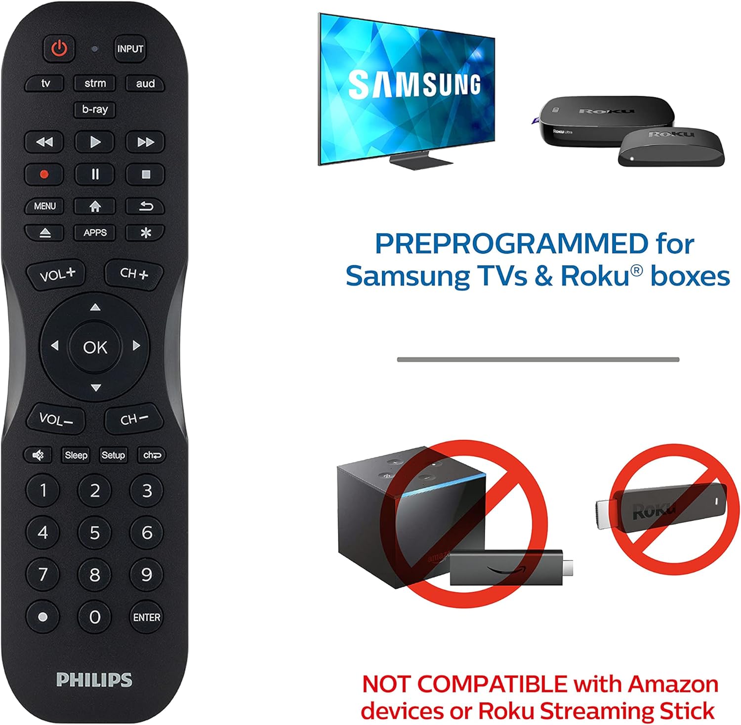 - STREAMING READY – Preprogrammed for immediate use with Roku boxes, as well as Samsung TVs. Not compatible with Roku Streaming Stick and Amazon devices.
