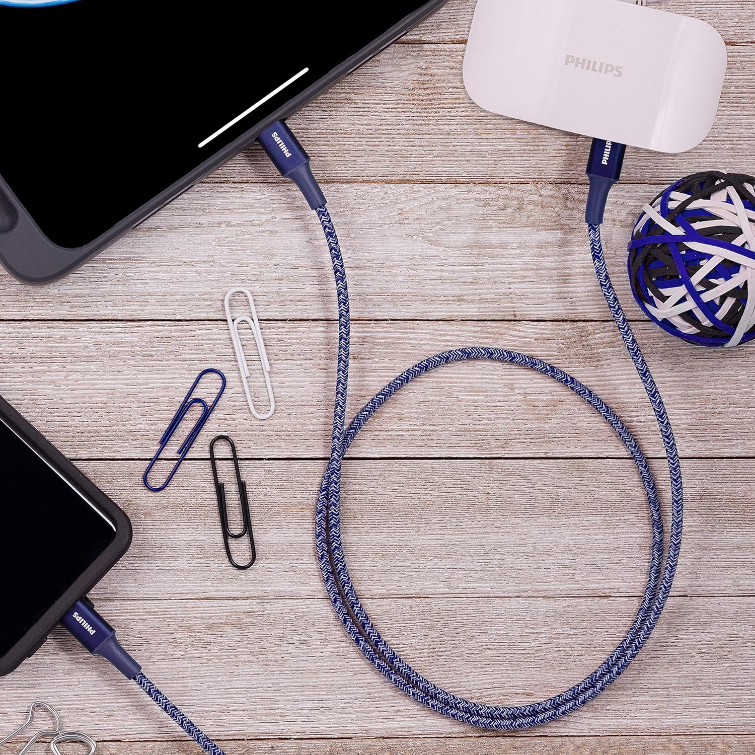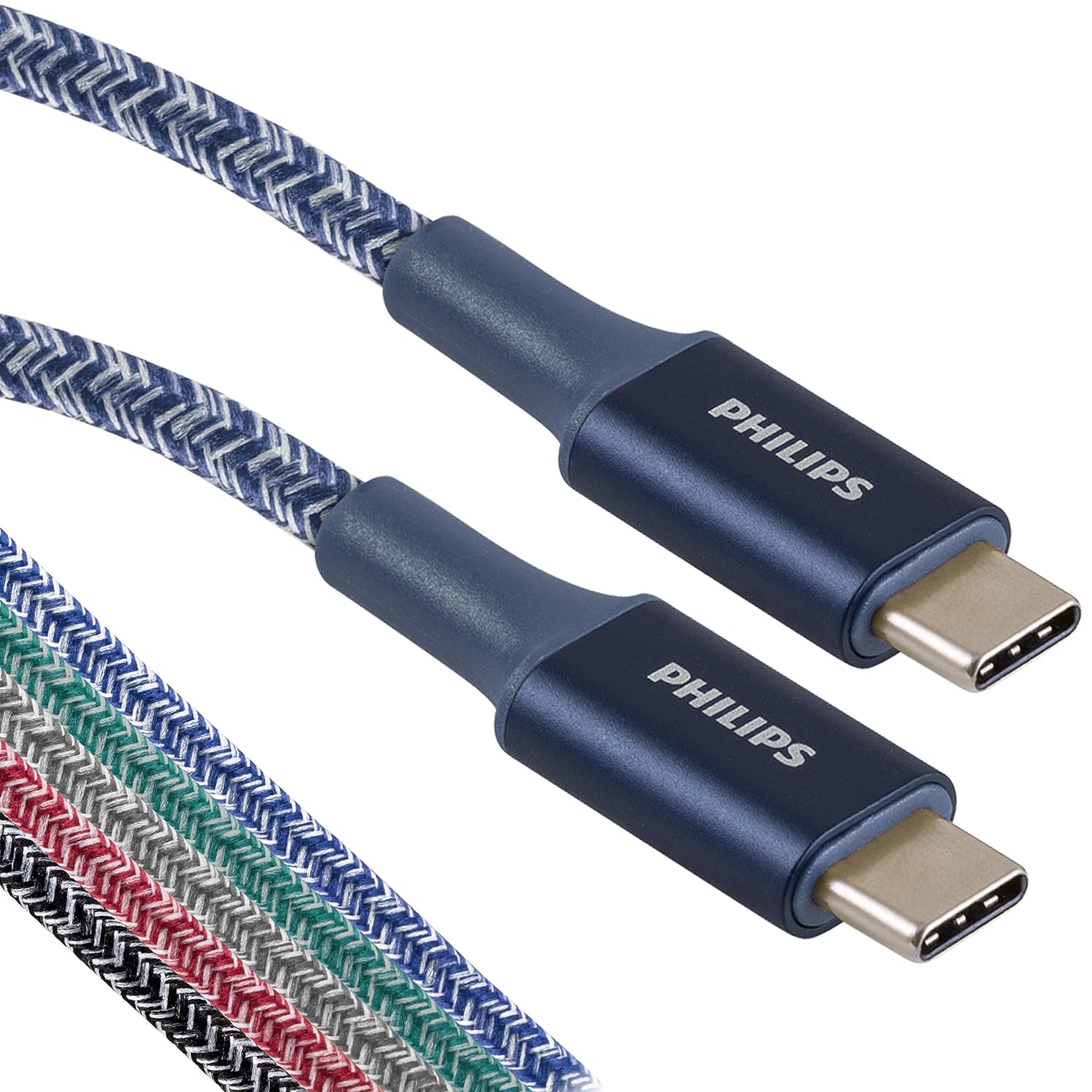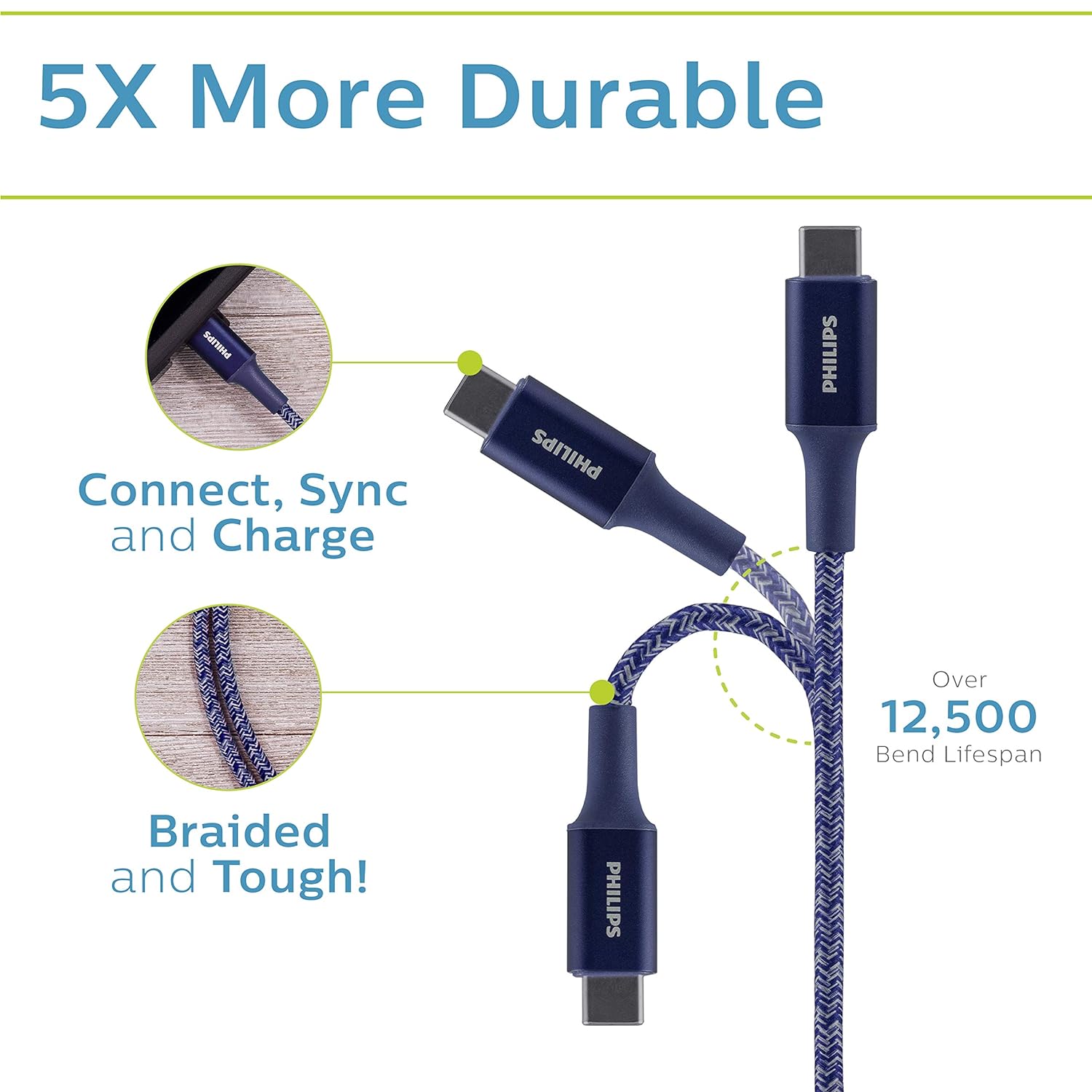 Philips 6 Ft. USB Type C Cable, USB-C to USB-C Blue Durable Braided Fast Charging Cable, Compatible with iPad Pro, MacBook Pro, Samsung Galaxy S10 S9 Note 9 8 S8 Plus