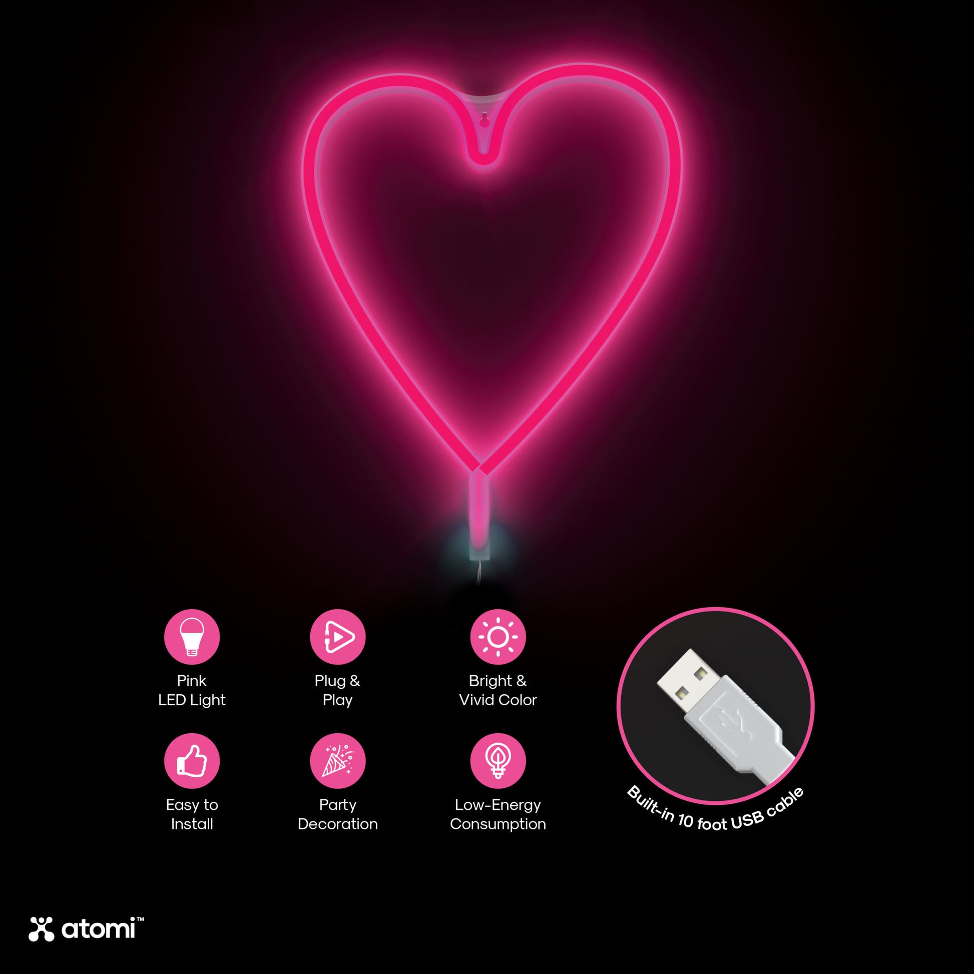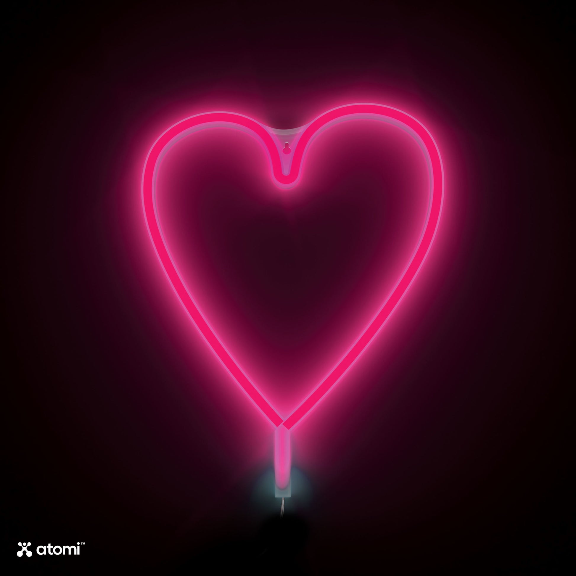 Show your love of fun decor with the Atomi Pink Heart Neon Light. This trendy LED light is a fun home accessory, bringing instant personality to any room. Easy to install and safe to use, it’s cool as a gift, as wall art, or a tabletop decoration. It’s perfect for illuminating dorm rooms, bedrooms, the family room, kids’ rooms, outdoor areas, and as festive holiday decor and special events!Neon LED light – perfect as wall decor in dorm rooms, bedrooms; even the kitchen and man cave.