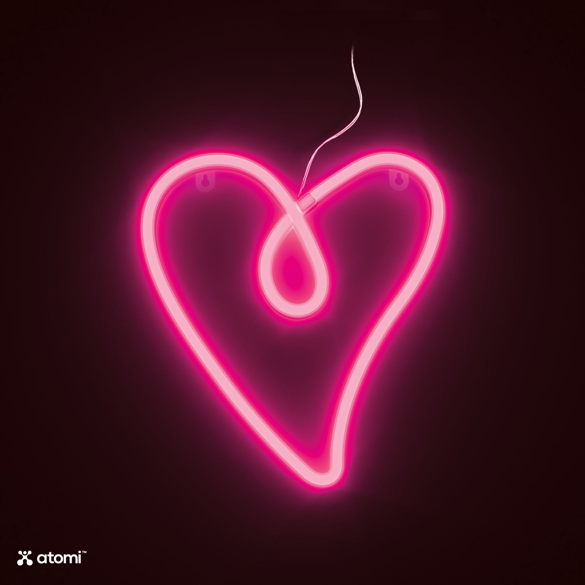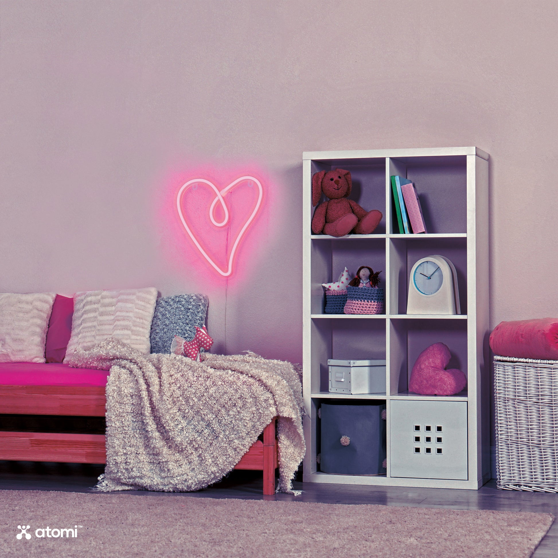 Show your love of 80’s decor with the Atomi Pink Retro Heart Neon Light. This trendy LED light is a fun home accessory, bringing instant personality to any room. Easy to install and safe to use, it’s cool as a gift, as wall art, or a tabletop decoration. It’s perfect for illuminating dorm rooms, bedrooms, the family room, kids’ rooms, outdoor areas, and as festive holiday decor and special events!