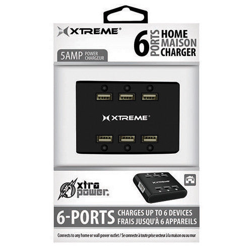 The black USB Charger from Xtreme Cables offers 6 USB ports and provides up to 5 Amps of power. Each of the 6 USB ports features an LED light which indicates when the port is in use. All ports can be used at the same time. This charger is powered through a standard wall outlet.
