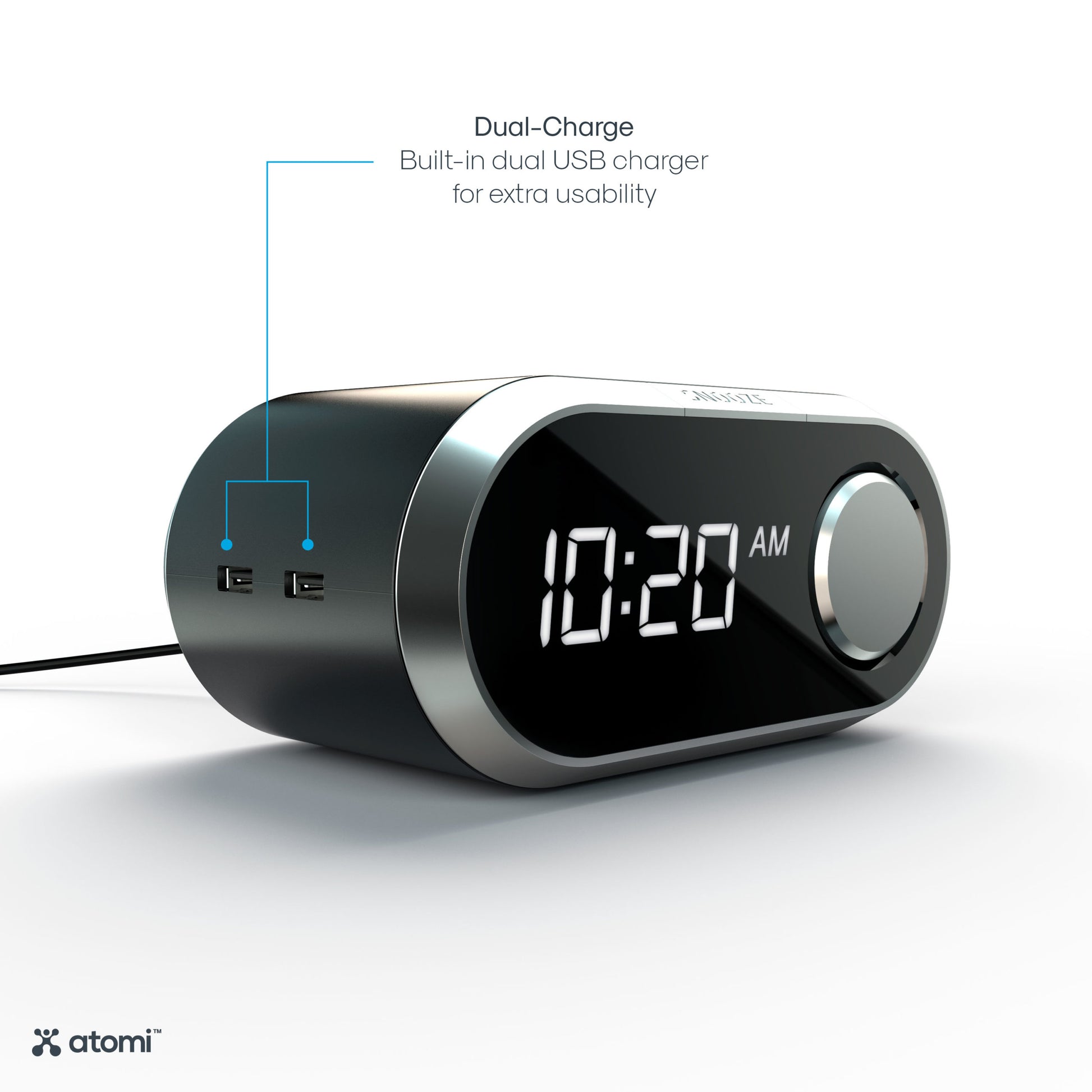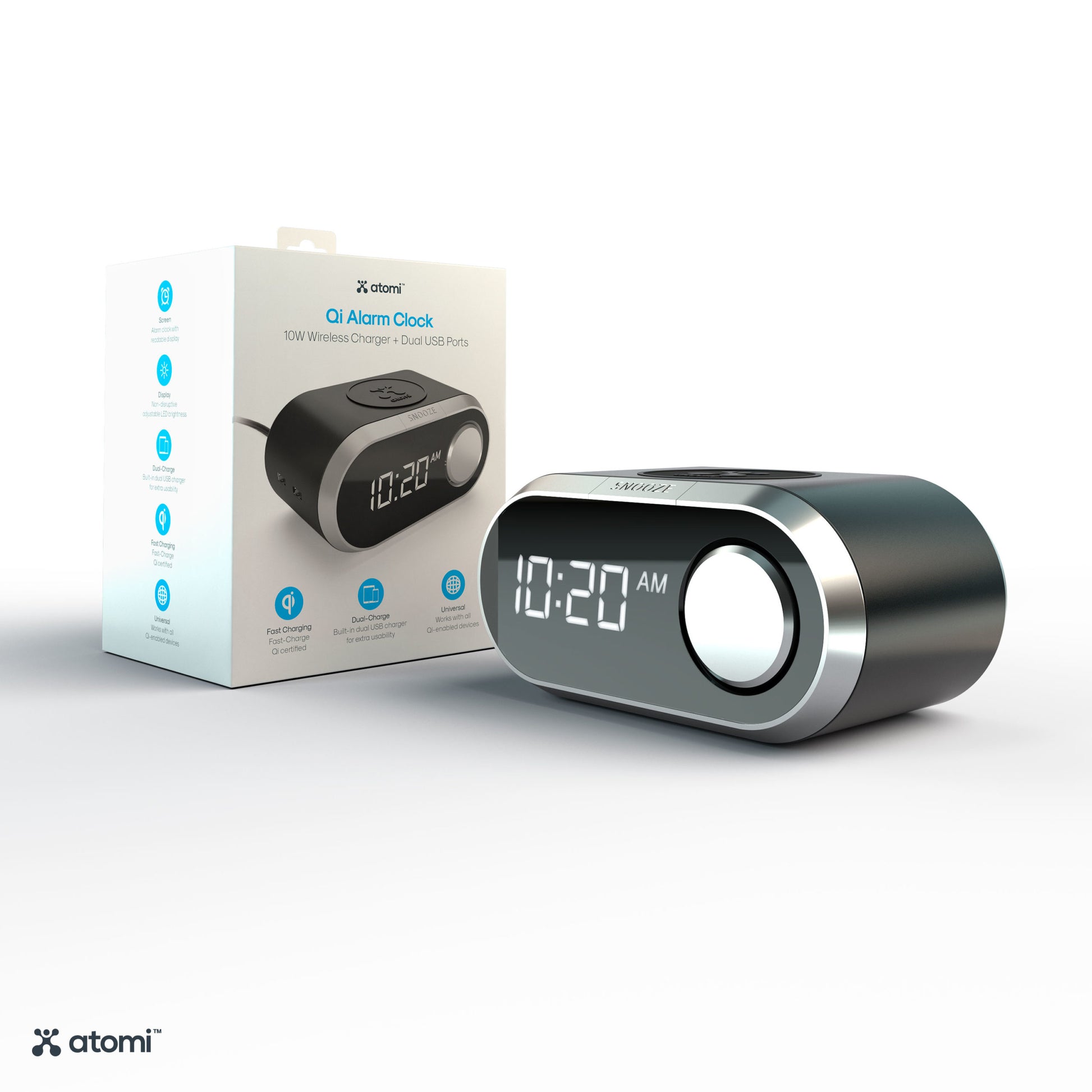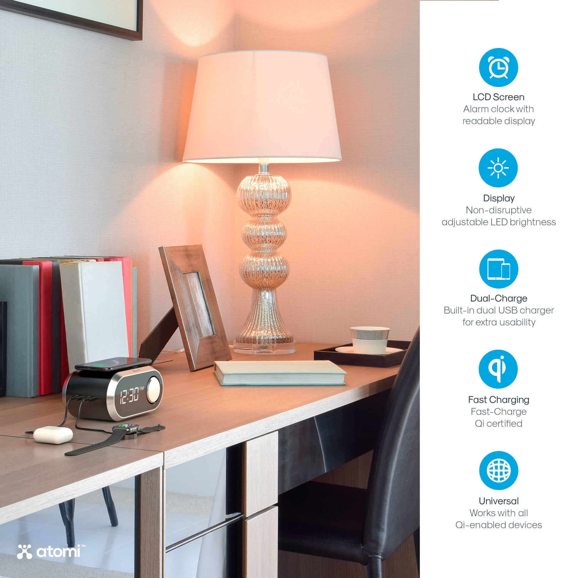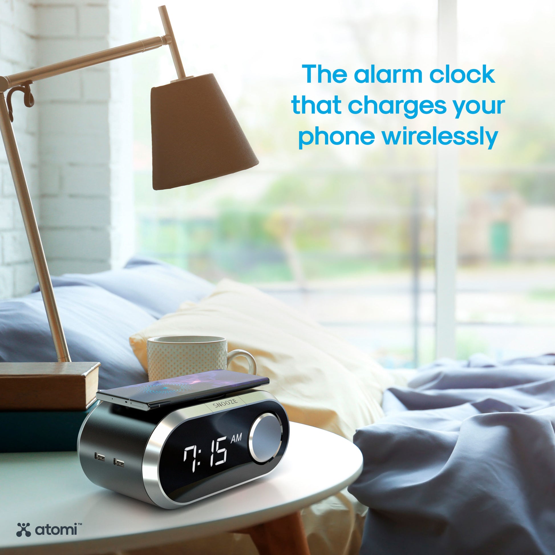 3-way alarm clock with USB charger, so you can charge 3 devices at the same time with a Qi certified wireless charging pad and 2 USB ports.
