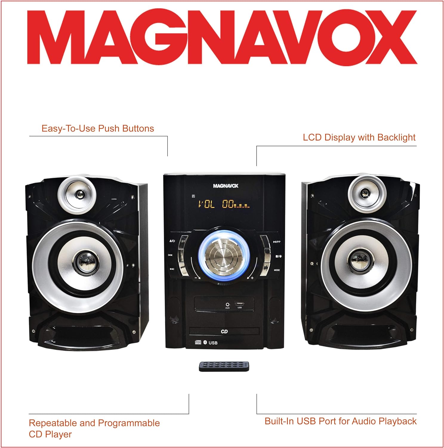 - KEY FEATURES: Tray loading CD player, total 50W RMS output (2 x 25W), programmable CD player, digital PLL FM stereo radio, decorative blue color lights, LED display, built-in USB port for audio playback, connects to any audio device via 3.5mm aux in port, Bluetooth wireless technology and AC operation. Accessories include: Remote control (uses 1 x CR2025 battery, included) and AC/DC adapter.
