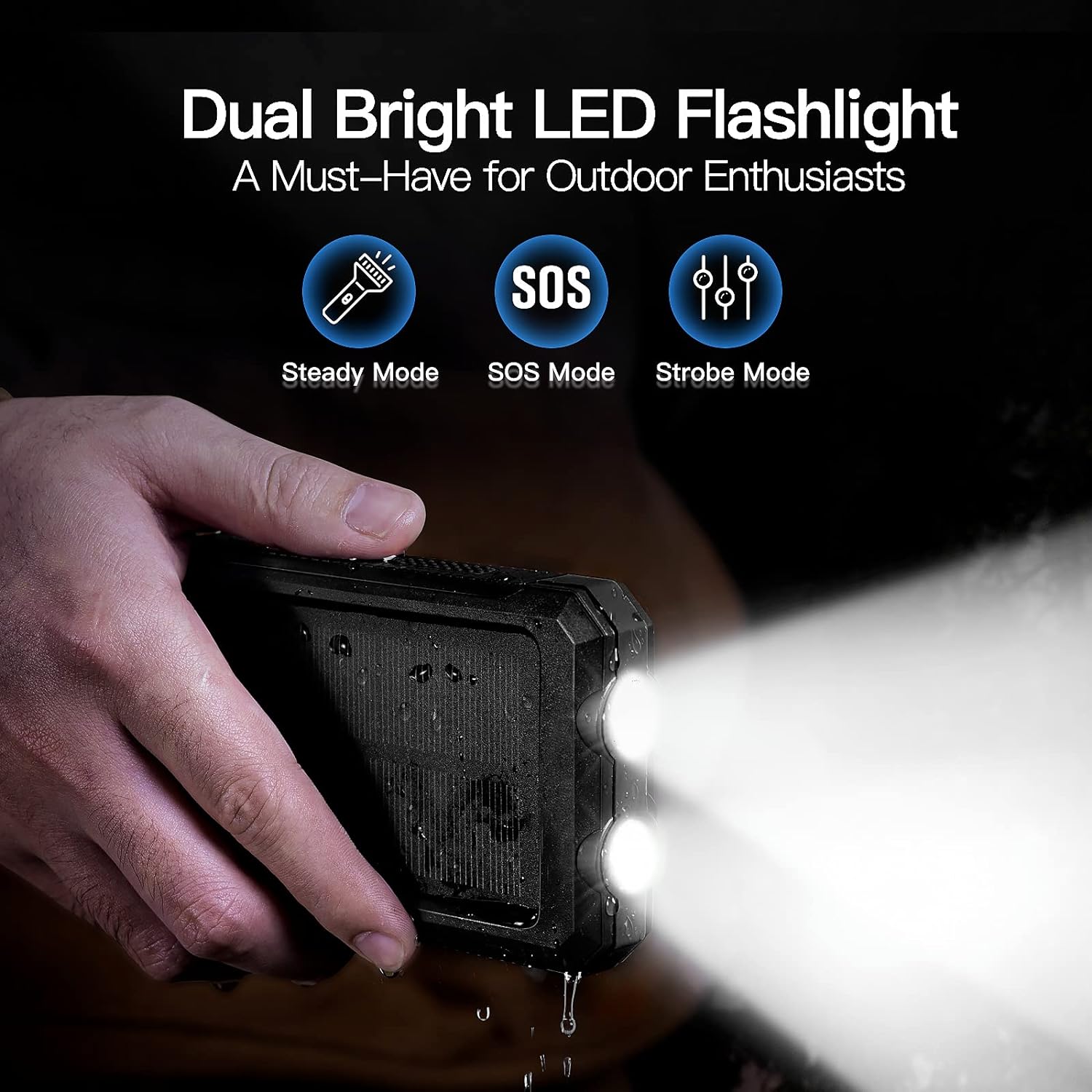 - Dual USB and Powerful LED Light - It makes it easy to charge two smartphones simultaneously or a tablet at full speed. 2 led lights can be used as flashlight with Steady-SOS-Strobe mode. Five pilot indicators show the status of the battery charger timely. The green light on when charging by a solar, blue light on when USB charging.
