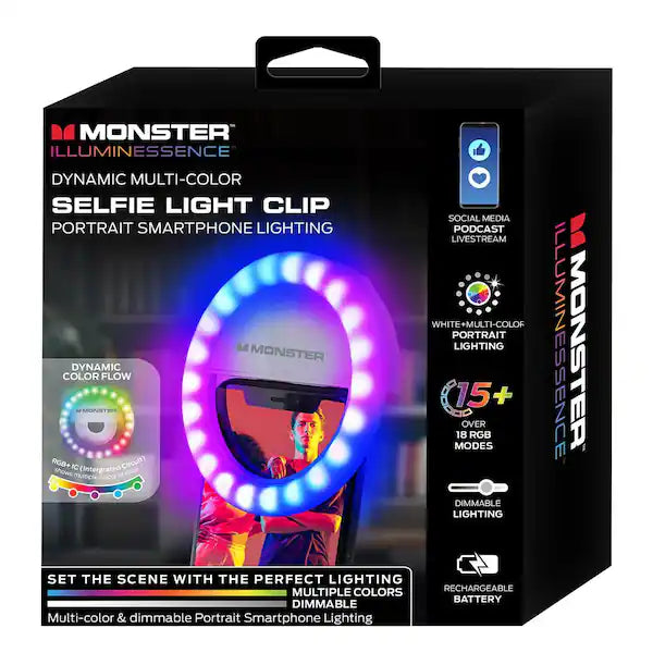Selfies are one of the most common photos people take and standing out requires something extra. The Monster Dynamic Multicolor Selfie Light Clip can provide exactly what you want. With 15 color-changing modes, you can enhance photos with unique and striking results. Easily switch between multiple modes with a single button. Attach your clip to your smartphone, laptop or tablet without a complicated setup. When it runs low on power, use the included Micro-USB cable and connect it to any compatible device port for recharging. Make your next selfie stand out with the Dynamic Multicolor Light Clip.