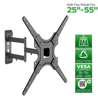 We all want a convenient way to set up our flat-panel HDTV without tearing out our walls. With the Xtreme Full Motion TV Wall Mount For 32-70 Inch Televisions, you can manage your home media setups without discussing wall repair. Our mount can support flat screen TVs ranging from 32 to 70 inches and can hold up to 88 pounds. You’ll be able to adjust the mount according to your existing space, whether it has to move to a specific angle or needs to be turned a certain way. It can swivel on a 90-degree angle and tilt up to 15 degrees and under 5. The heavy-gauge steel construction is durable and provides for a solid foundation for any TV you decide to connect. A precision mounting with magnetic levels allows you to get the most accurate position when installing it into your wall. Our mount meets the VESA mounting requirements of 100x100 through 600x600, giving you a wide range to attach and properly install it. Get your TV situated in the right place with the Full Motion TV Wall Mount For 32-70 Inch Televisions.