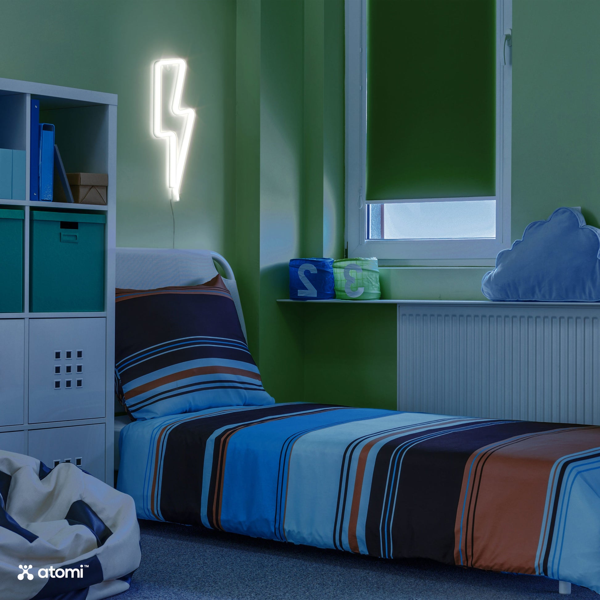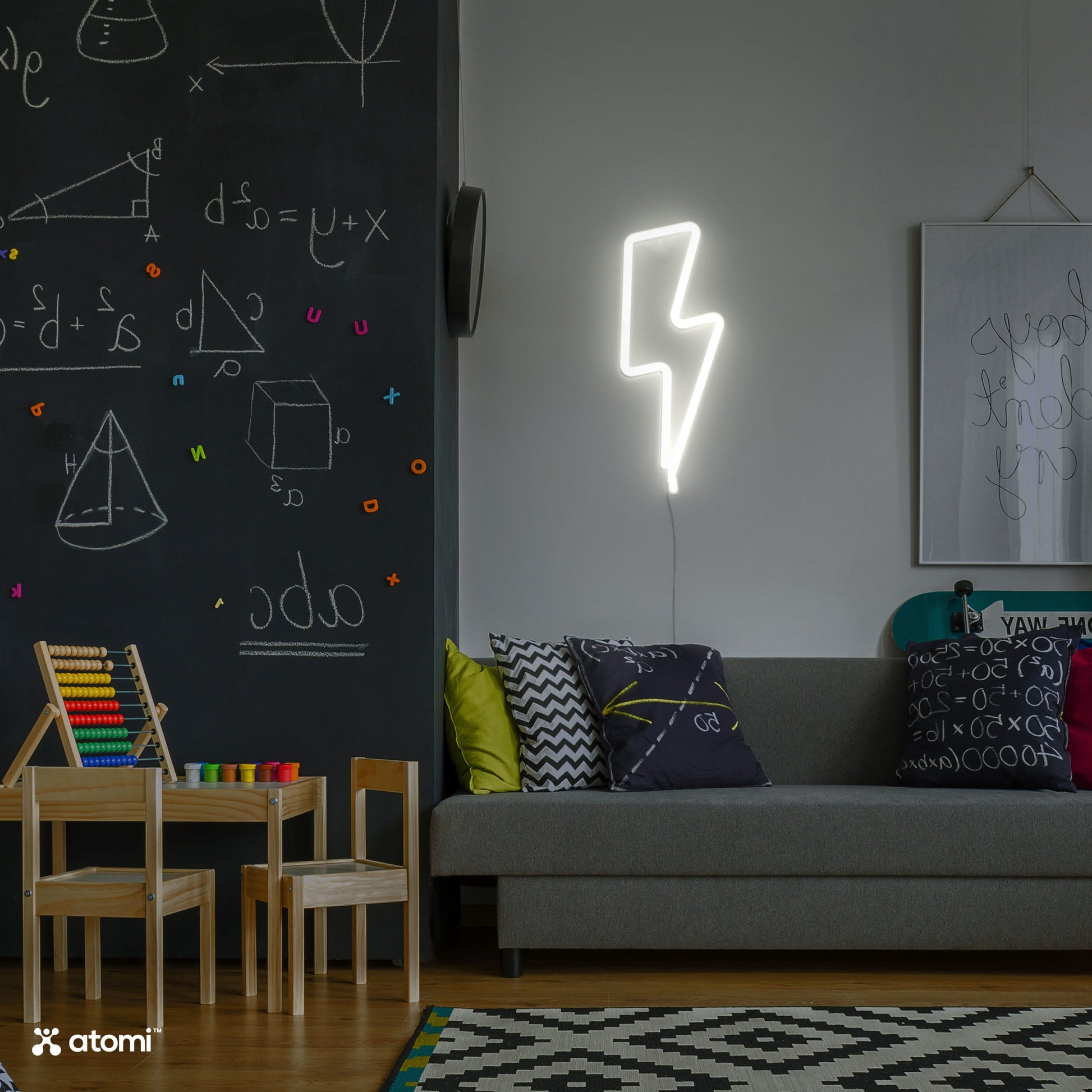 Bring the moon indoors with the Atomi White Bolt Neon Light. This trendy LED light is a fun home accessory, bringing instant personality to any room. Easy to install and safe to use, it’s cool as a gift, as wall art, or a tabletop decoration. It’s perfect for illuminating dorm rooms, bedrooms, the family room, man caves, kids’ rooms, outdoor areas, and as festive holiday decor and special events!